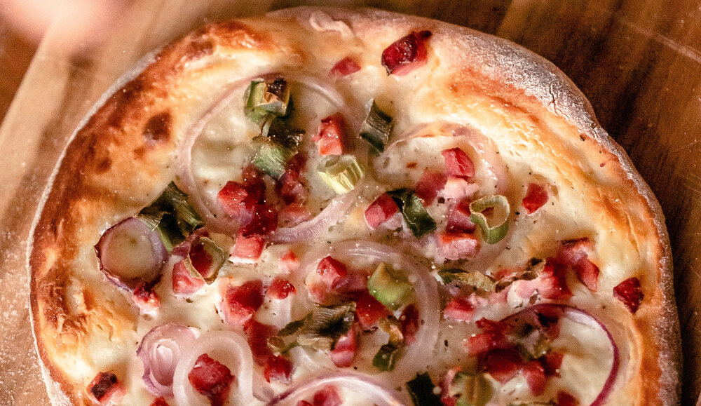 Einfache Flammkuchen. Schmecken auf einem Pizzastein gebacken am besten, Können aber auch auf einem Backblech in den Ofen geschoben werden.